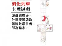 透過簡單的「牌七(接龍)」方式,遊戲化學習人體消化道的組成(組織/器官)及排列順序,同時加上不同的消化腺(外分泌腺釋出消化酵素),讓玩家了解人體的消化系統。